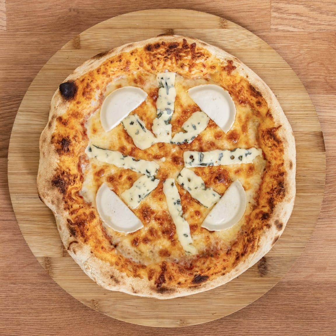 Tomate, fromage, Camembert, Gorgonzola, chèvre et origan. Taille au choix.